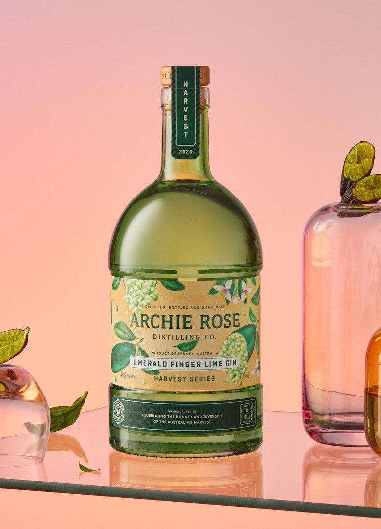Australian grown ingredients have also served as an artistic showcase for our Harvest range of gins and whiskies, as created by our design studio partners Terry and Matthew Squadrito from Squad Studio, and artist Heidi Willis through her gorgeous depictions of poorman’s orange, sunrise lime, lemon scented gum and raw honey. Our latest Harvest Gin release, Emerald Finger Lime Gin, is a glorious scene of vibrant caviar like finger lime pearls, spilling from the fruit as painted in beautiful watercolour by Jodi Hooker, our Design & Packaging Manager.