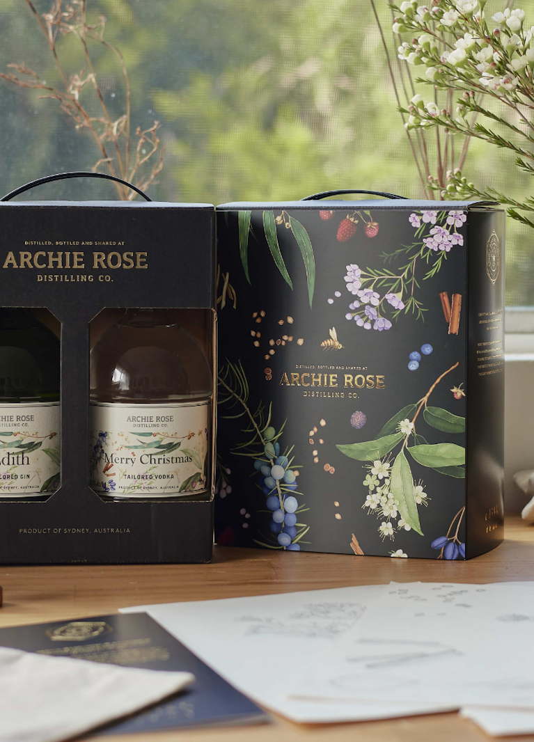 Collaborating with Archie Rose to create their 2022 Christmas packaging was a really fun project for me! I was given a list of the botanicals that Archie Rose uses in their spirits and I had a look through those, doing research into gin making and what native Australian botanicals I wanted to feature. I wanted to create this sense of the botanicals floating through and interweaving in the liquid, enabling drinkers to visually connect with the botanicals in their Archie Rose spirit of choice.
