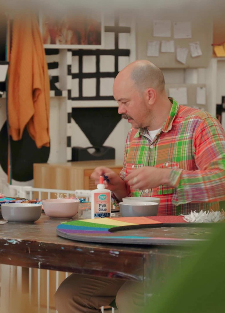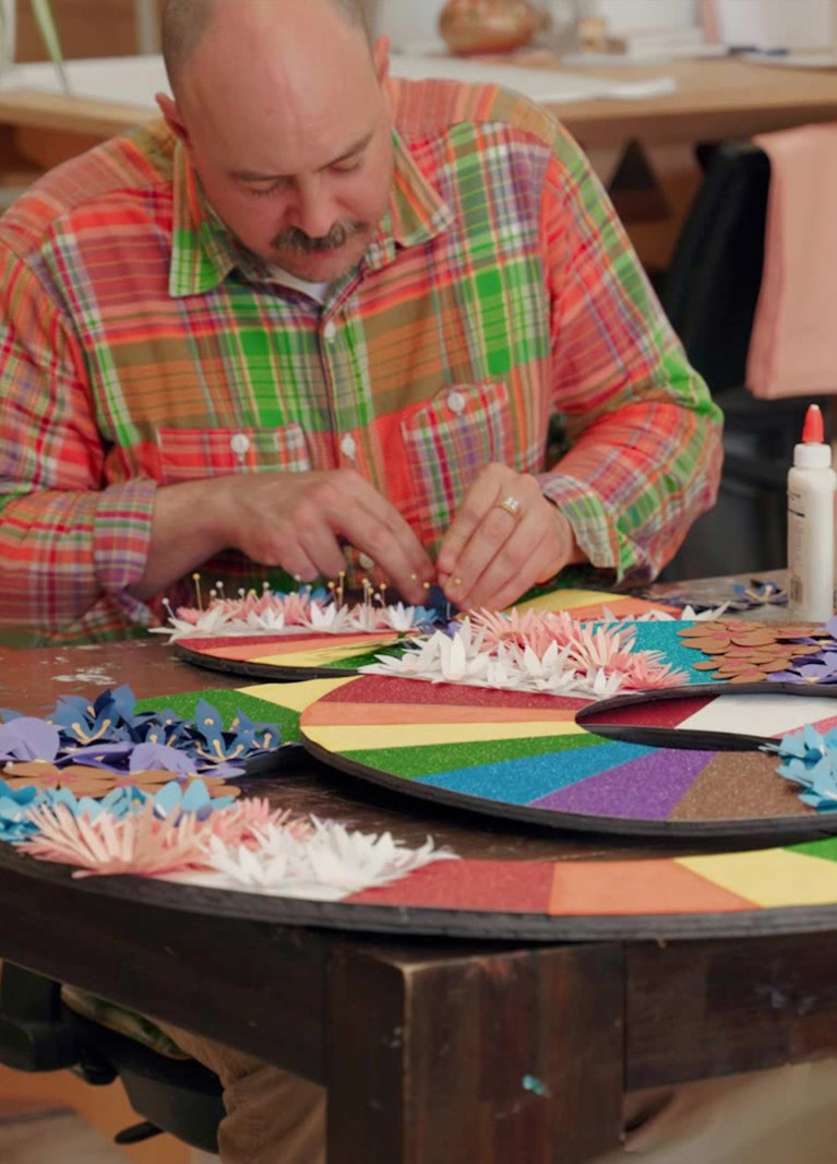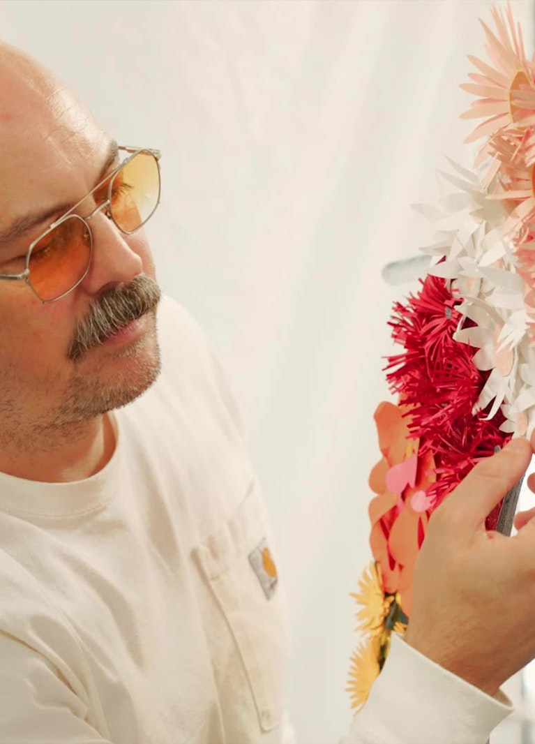 I've been very excited because, obviously, Archie Rose's campaigns for Mardi Gras have become iconic. And Archie Rose is an iconic Australian brand. So, to be given the opportunity to collaborate with Archie Rose is a great honour. I pitched a whole different bunch of ideas, but it was mainly around flowers. Now, if I've got to be honest, I don't think anyone's made more paper flowers than me in the world. I've made a lot of paper flowers. So I was like, oh, flowers, you know, here we go again. But actually something amazing happened in this, in this collaboration with Archie Rose, where I don't know, like I was making these beautiful flowers and we were kind of adding it in this really incredible, interesting pattern and we obviously created this layered set. The process has been really interesting because the initial idea was the mirrorball. Which is obviously a very celebratory object, refracting light around.