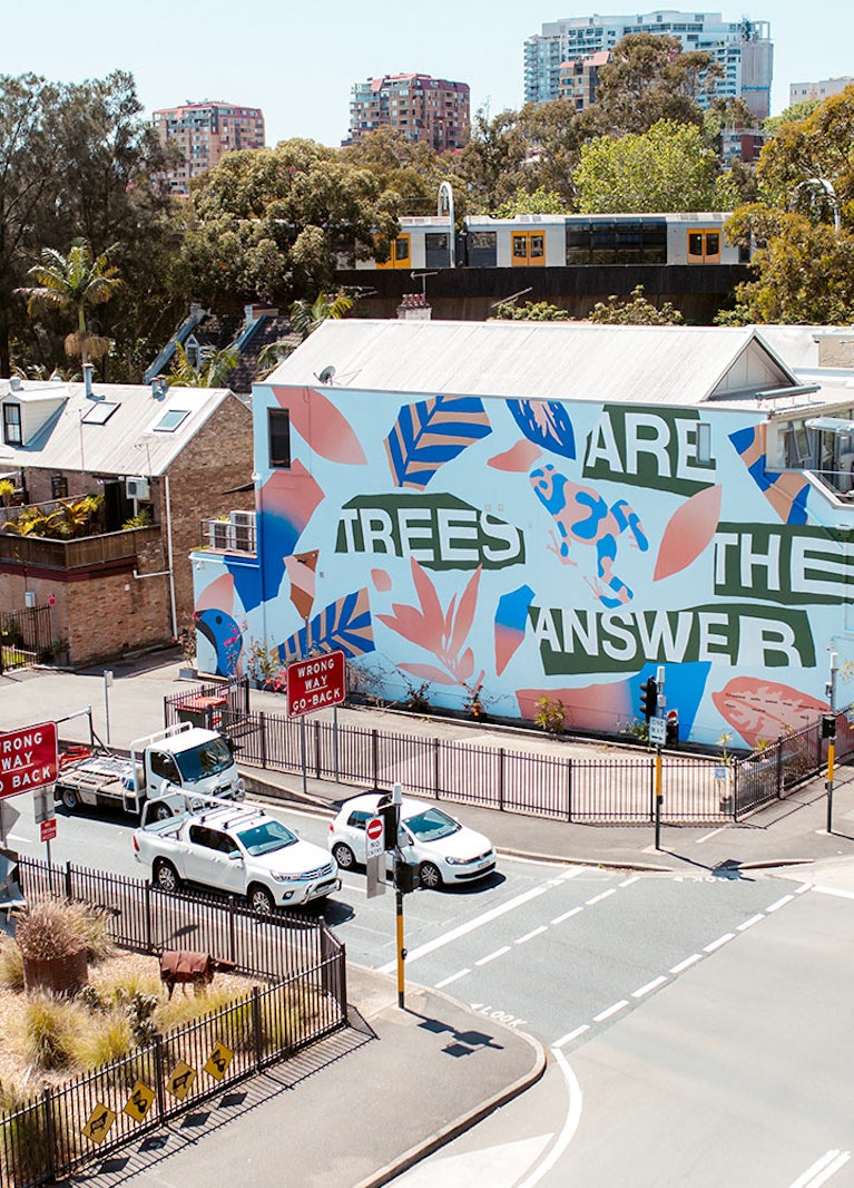 Elliott's new public mural in Sydney, located on the corner of Cathedral and Palmer streets, Woolloomooloo.
