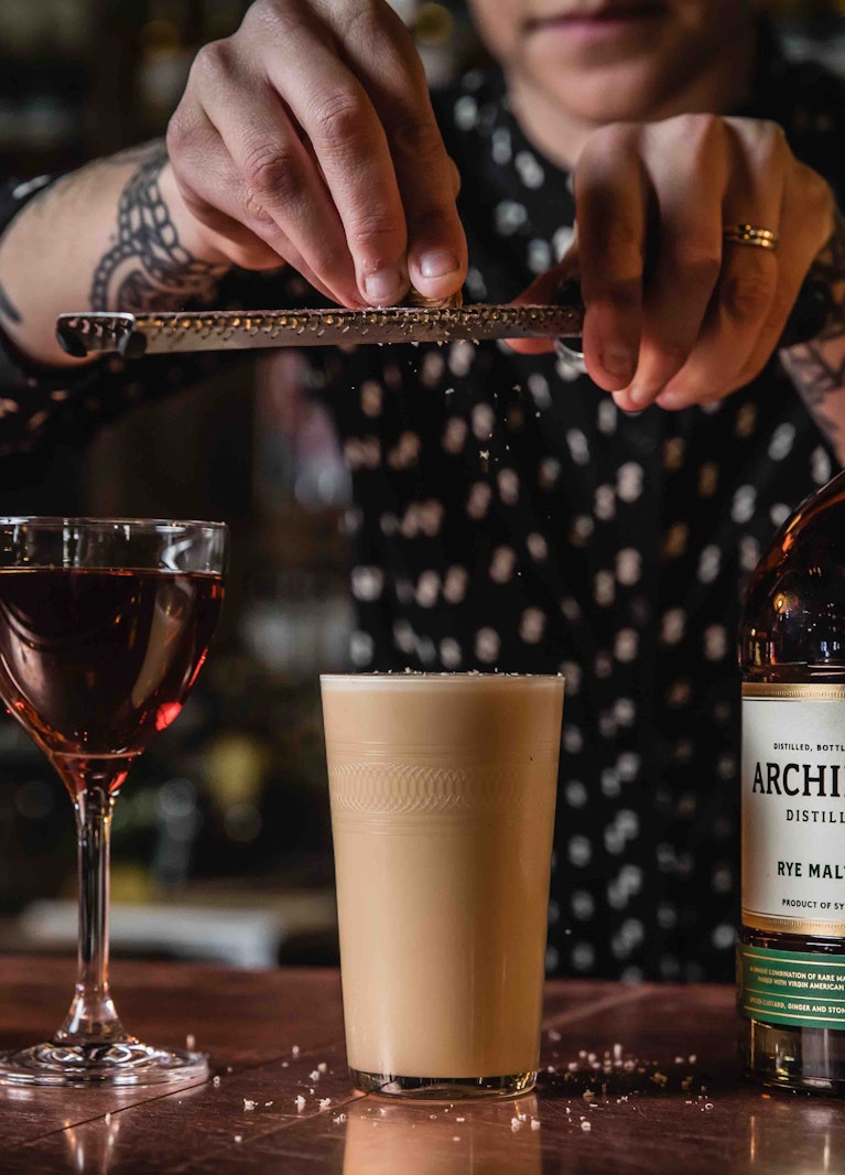 Nutmeg has long been used on cocktails for a couple of excellent reasons. Number one: it's delicious. Number two: a grating of nutmeg is greatly utilised on a cocktail with egg white or whole egg in them. Egg can sometimes omit an 'egginess' or sulphuric note that can throw off a well-balanced cocktail. Something scattered on top can mask this very well. That could be nutmeg, or a dusting of chocolate, or the spritz of a citrus twist. Nutmeg is often used on a Whisky Sour or a Flip.