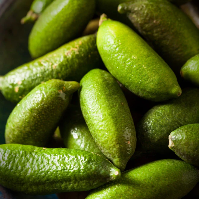 Emerald Green Finger Lime offers an intense acidic lime flavour with bitter notes. As for aroma, think kaffir and Mankrut limes meet lemongrass.